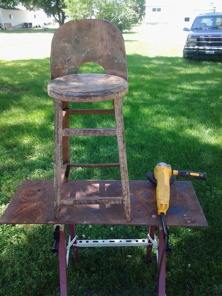 This past weekend we spent the 4th Holiday with my in laws at their farm. It is always a fun time. We had a bbq with family, took rides in the new golf cart that was purchased for my mother in law, and finding little kittens in the barn. While in the barn there were two metal stools that caught my eye. They were nothing but rust without any paint left on these gems at all. Oh the wheels they started turning. My father in law said I could have one, my heart was happy. I saw ideas of whimsy and fun. This was a complete blank canvas for me. This was a project to let out my creative being. I can sadly say I lost sleep over this project. I wanted and needed to get this done. I could see the finished project in my head. I needed to get those images into real time.