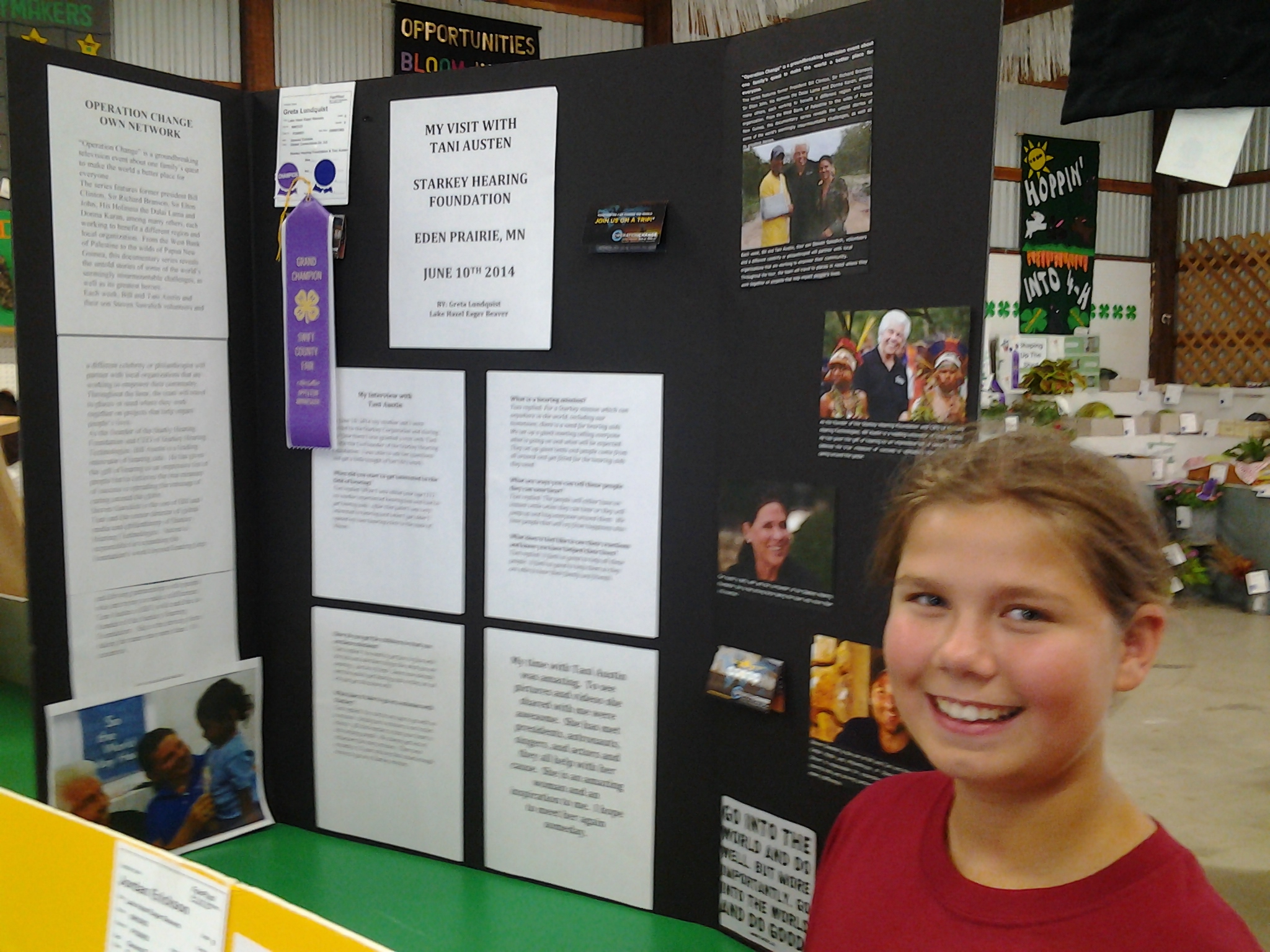Education Takes Grand Prize: Greta LundquistBy Rachel Janis, staff writer Eleven-year-old Greta Lundquist stands before two large trifold poster boards, fashioning a welcoming smile as onlookers peruse the Swift County Fair in Minnesota. Her poster boards—one entitled “Being Hard of Hearing,” and the other, “My Visit with Tani Austen, Starkey Hearing Foundation”—capture curious eyes, and Greta confidently answers questions and explains why she is there. The soon-to-be sixth grader actually has normal hearing, but because her mom was scheduled to be fitted for hearing aids at the Starkey Hearing Foundation’s office, Greta accompanied her and received the opportunity of a lifetime. And as she proudly showcases her two poster boards at the fair, she can’t help but to think about that special day—sitting one-on-one Tani Austen, co-founder of Starkey Hearing Foundation, for an interview.