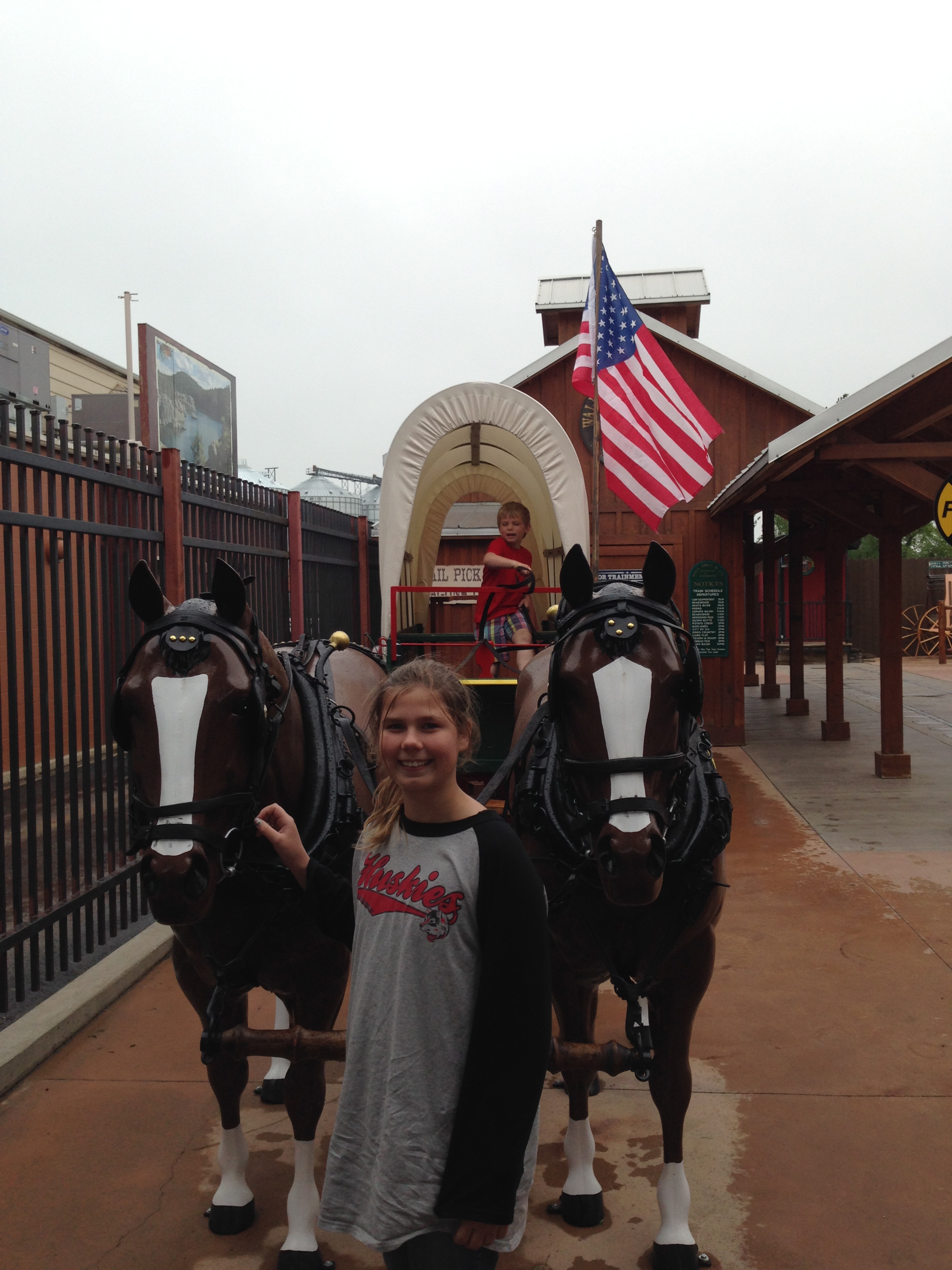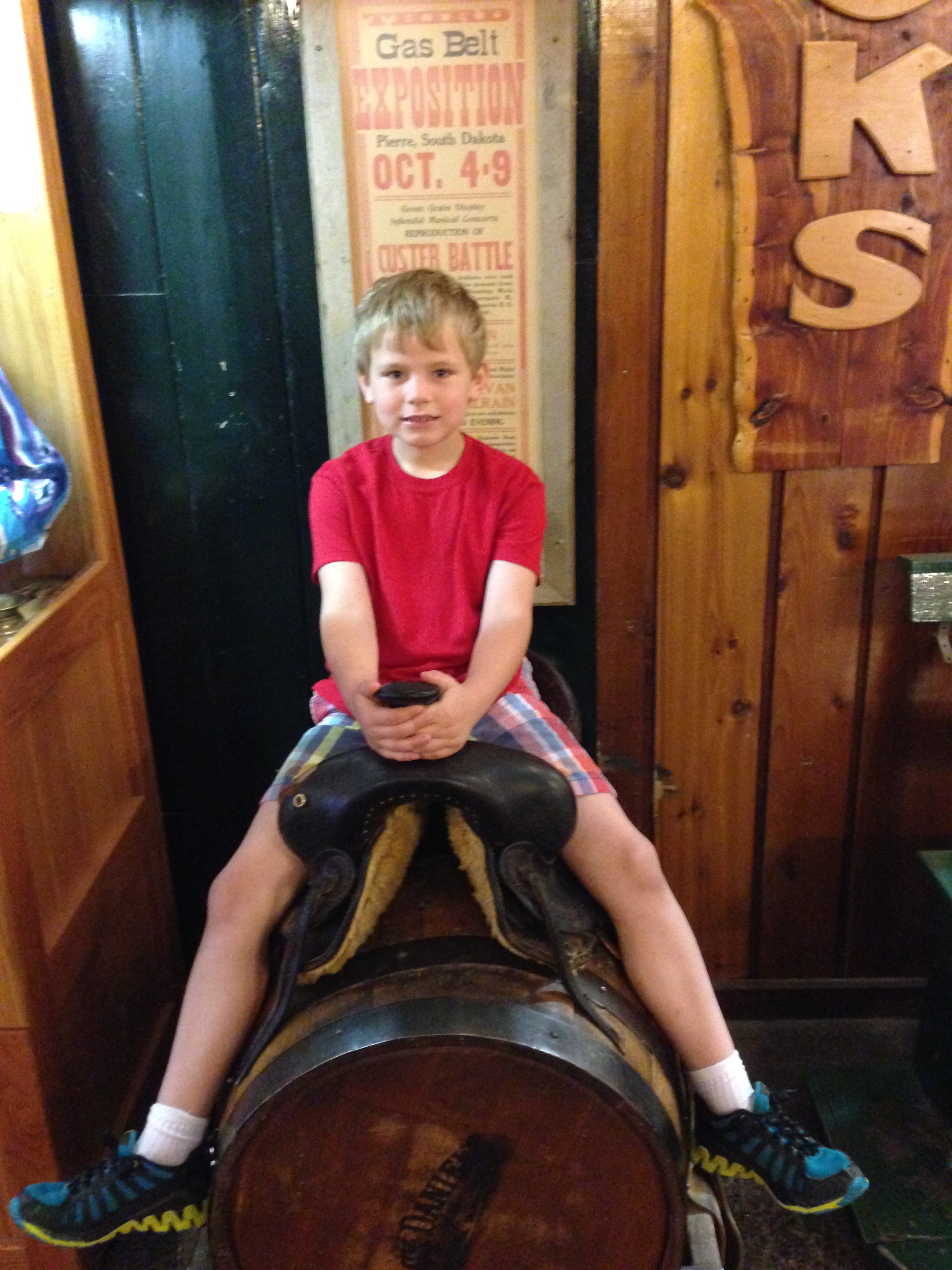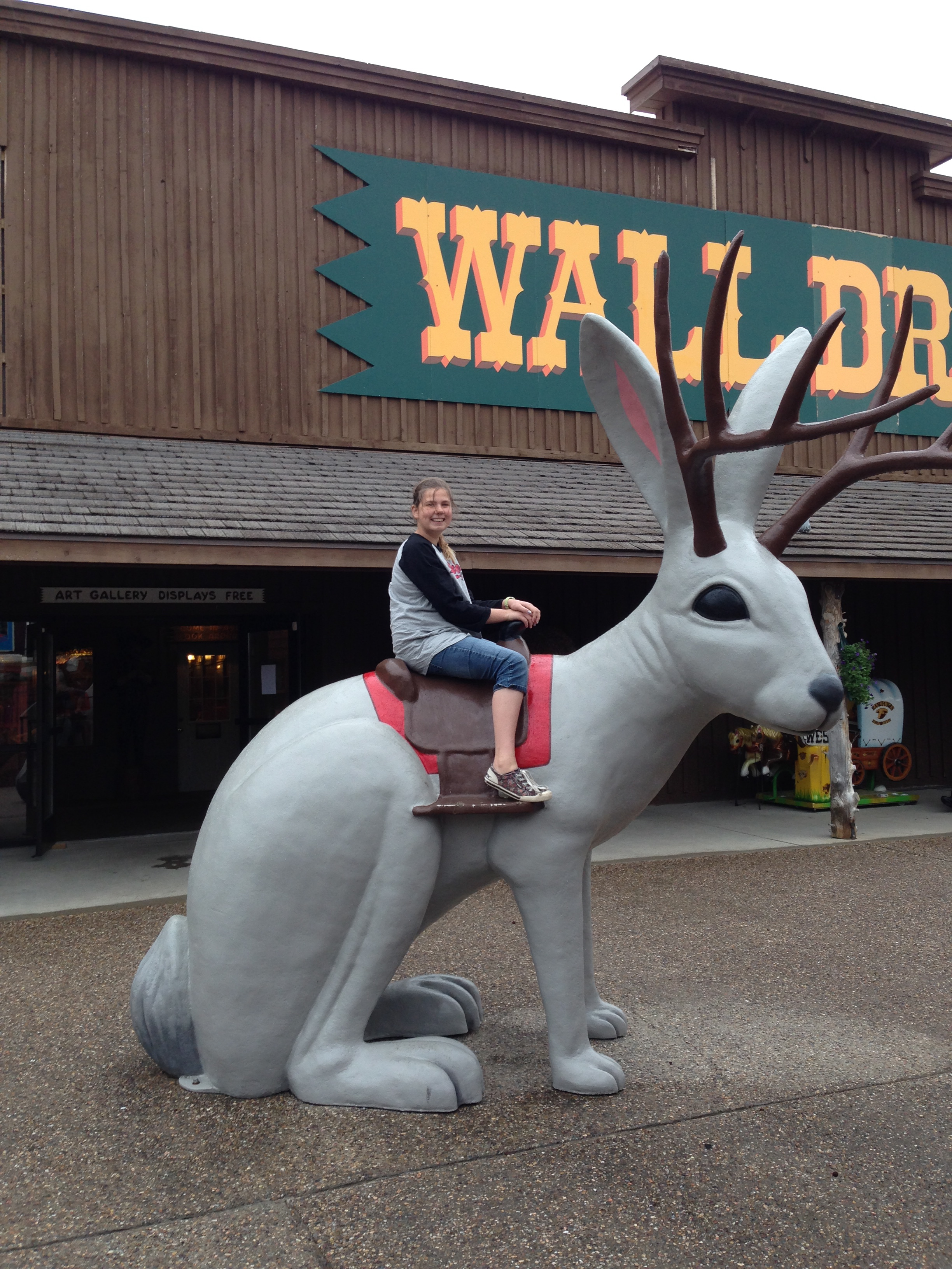 Day 2 started with rain and a lot of rain. Packing the van and the pod is not fun in pouring rain but my husband stood on the step stool and just did it. We headed west towards Murdo. That was our first stop. We had decided that we wanted to see and experience 1880 town. When we pulled into the town it was raining and closed. Oh Well we will hit 1880 town later in the trip. So we kept plugging along in the rain towards Wall, the magical place of Wall Drug. We got to Wall Drug and it wasn’t very busy and it was only 45 degrees. Very cool but the rain had stopped. The kids LOVED Wall Drug and I have to say I enjoyed it also. It was a fun place to see and explore. I learned later I missed half of Wall Drug but no worries we stopped again on the way home.