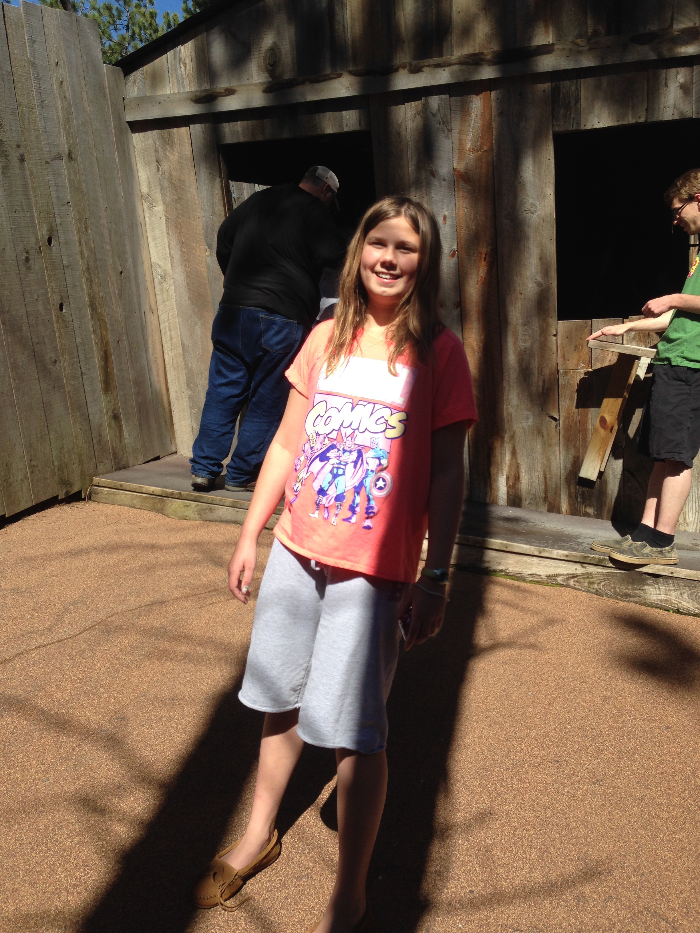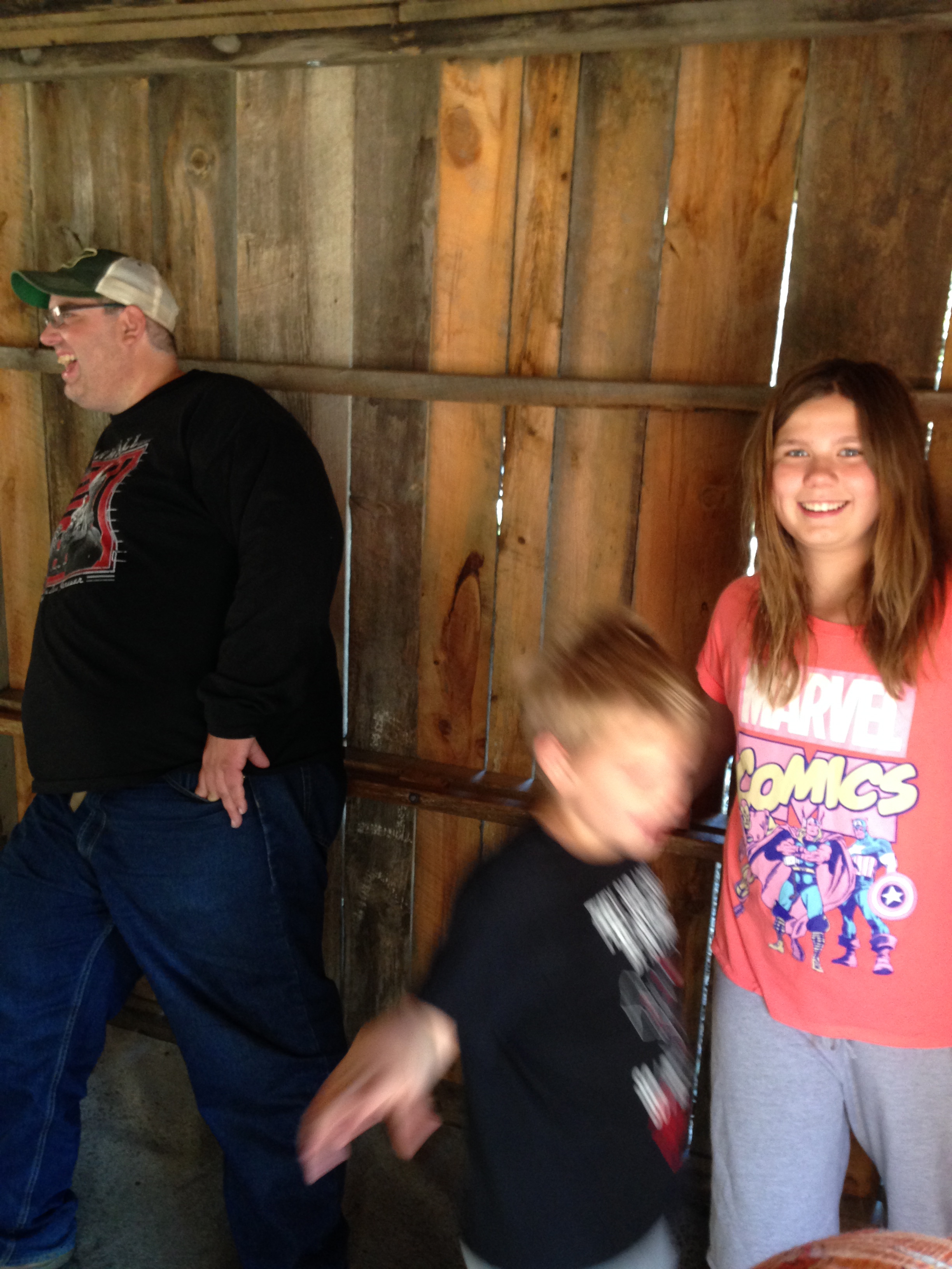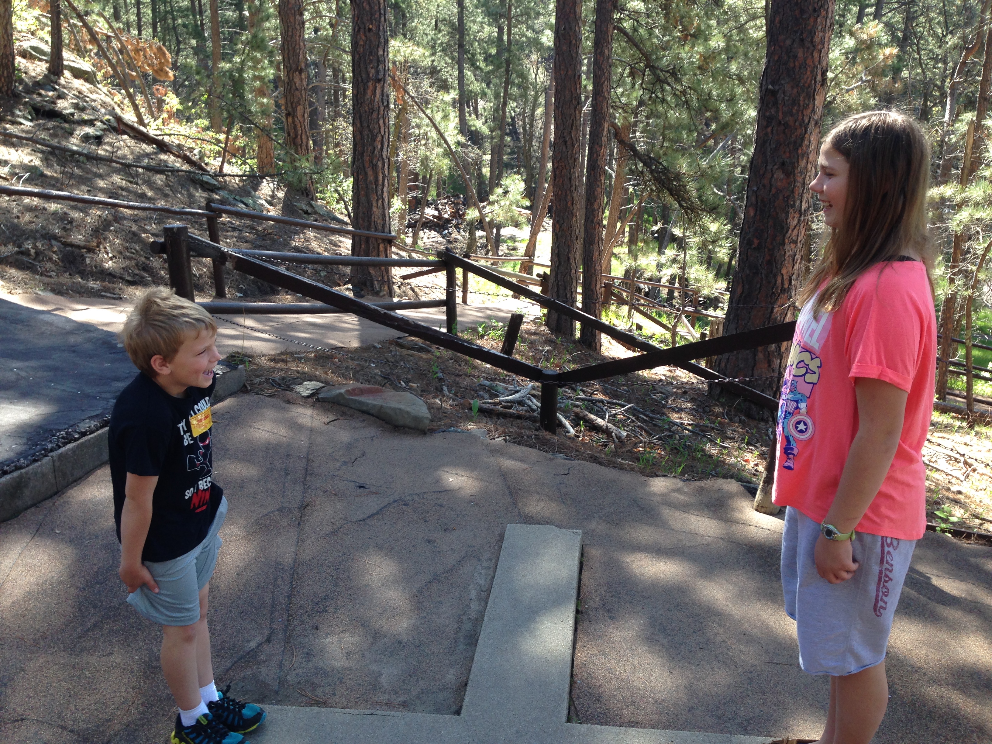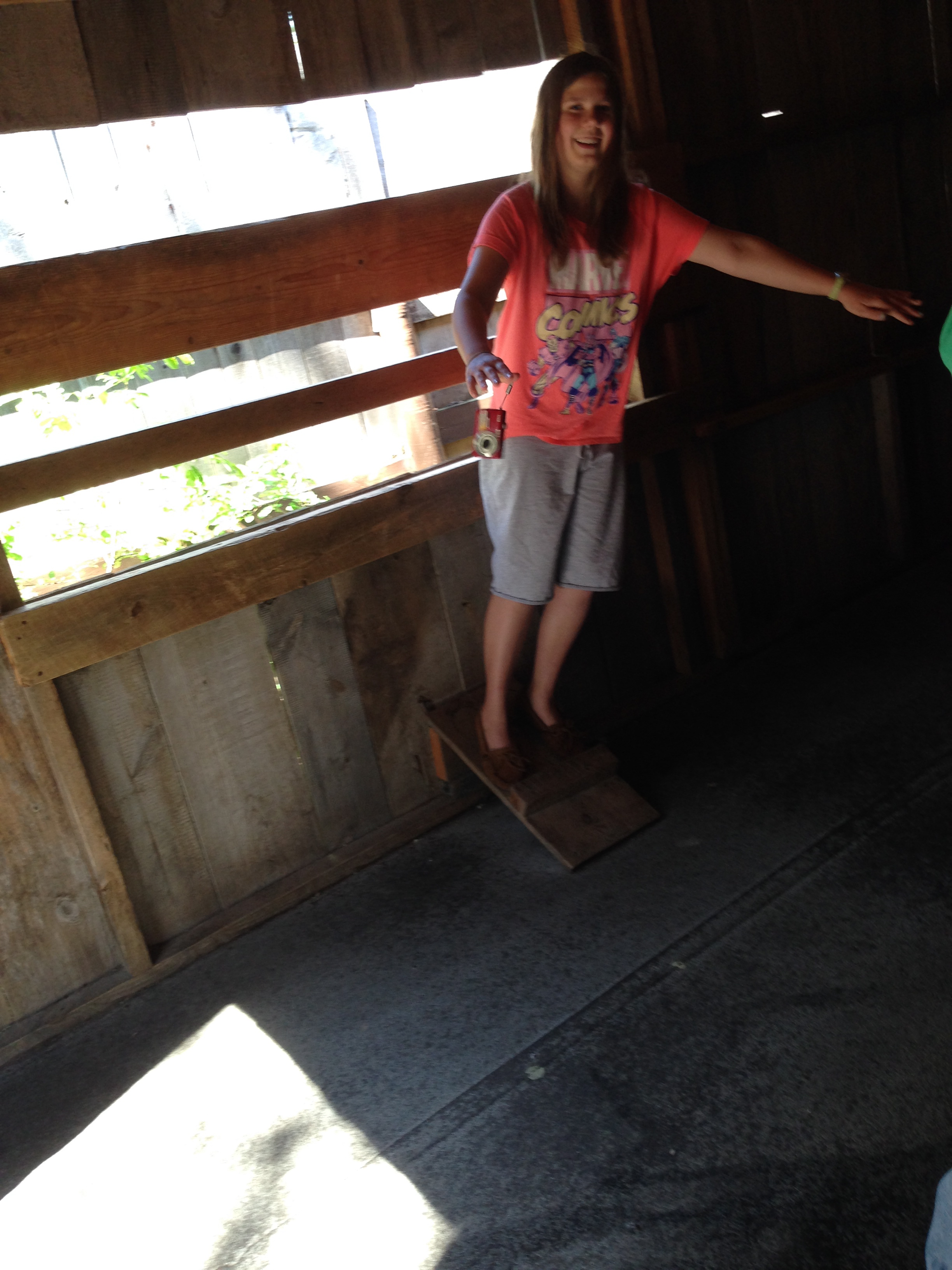 Our first stop today was the Cosmos Mystery Stop. It is a cabin up on a mountain side where everything defies gravity. You stand sideways, water runs uphill, drop a tennis ball and it goes uphill also. It is a place of mystery or to my husband it is a place of trickery and everything is built on such exaggerated angles what you think up is actually down. I don’t know all I know it was a steep walk up that mountain and when I got up there I was so dizzy I felt sick. I have terrible balance and have a tendency to stumble on flat normal ground I thought for sure I was a goner up there. My head was spinning and I was so dizzy I am really shocked I didn’t go down. The kids and Chad laughed the whole time up there. They did the experiments and had a grand time at the Cosmos Mystery Stop.