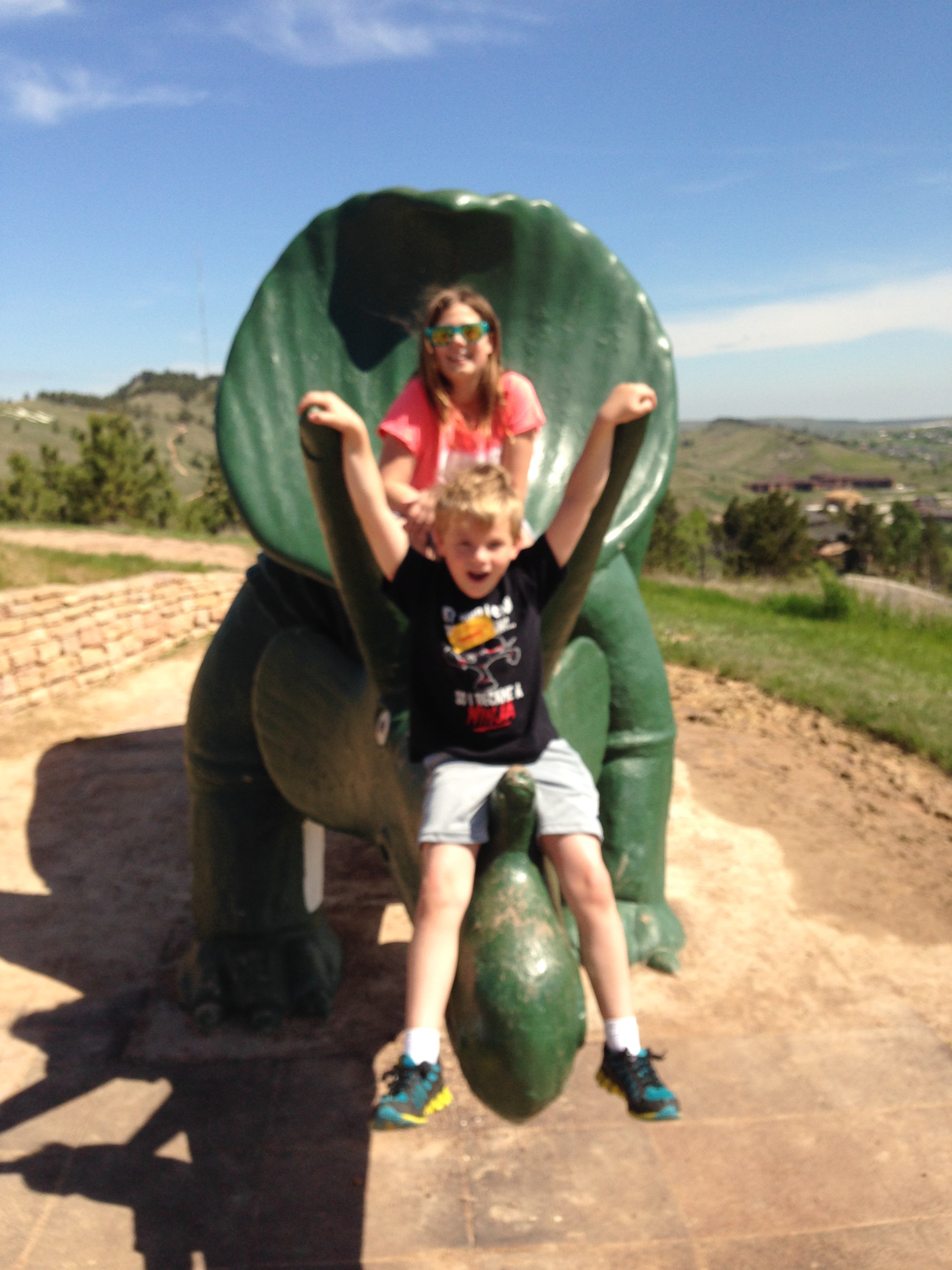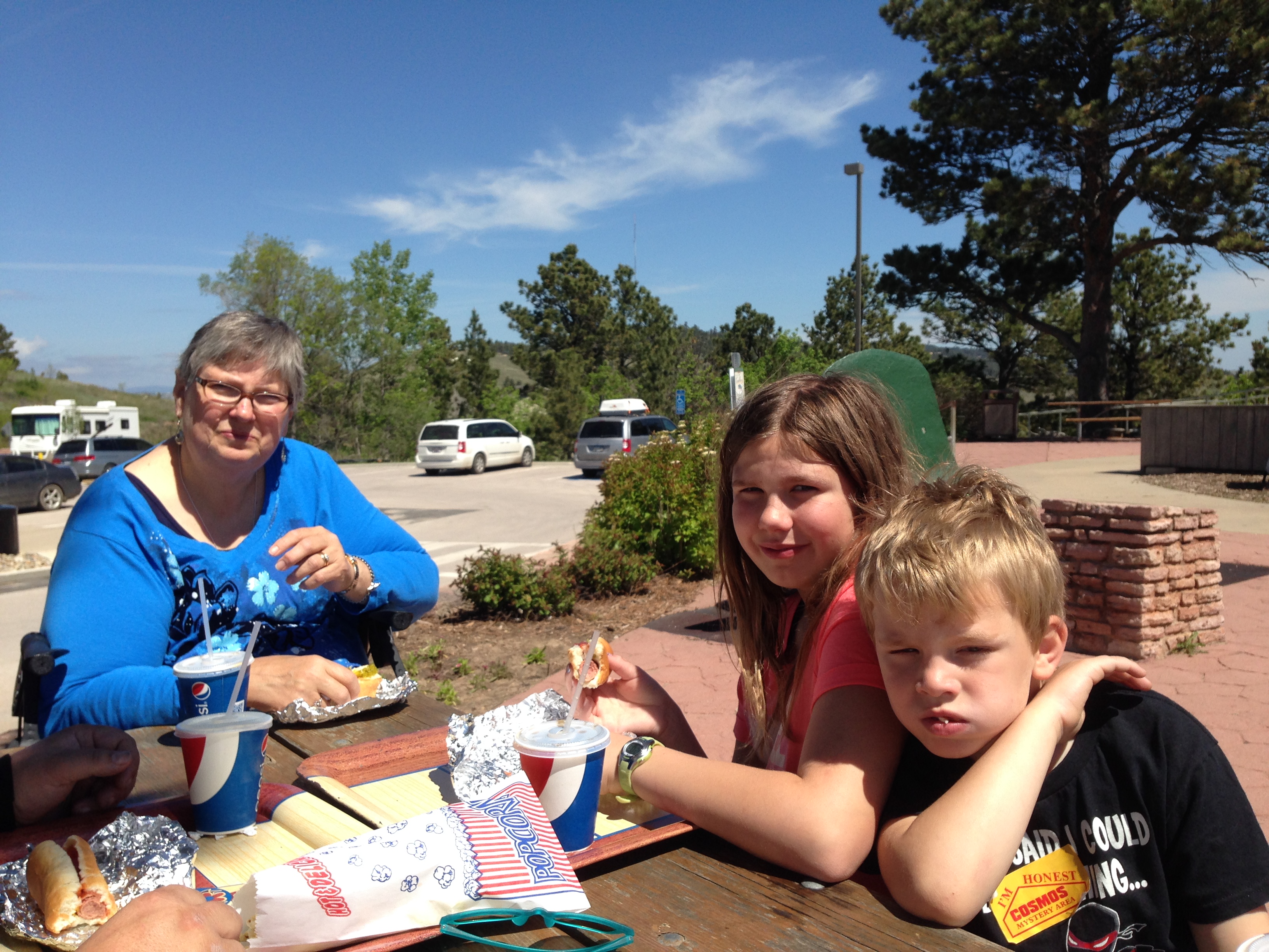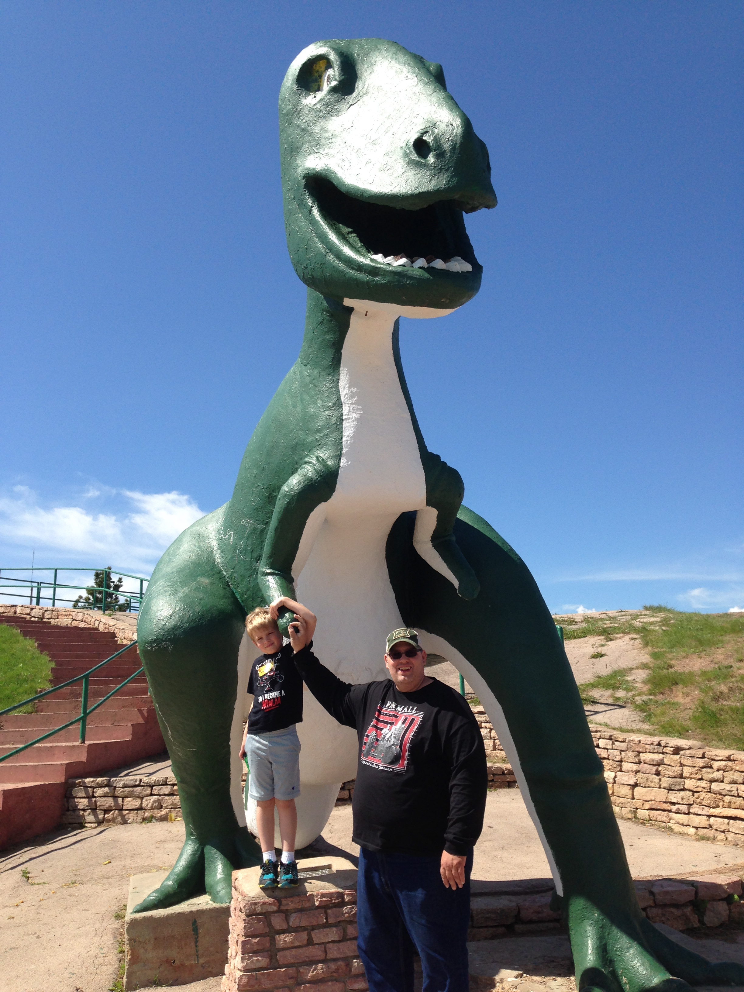 We left the dizzy producing fun spot and continued on to Rapid City. We stopped at Dinosaur Park this was suppose to be a highlight for Henry and Grandma. They were so excited to have a picnic in Dinosaur park. Well we got there and there were about 500 steps to get to the park. Ok maybe a little less than 500 but there were a ton straight up the hill or mountain. My mother in-law is in a wheelchair/walker. It wasn’t going to happen the dream of the picnic was over. I felt soooo bad about the situation. My in-laws stayed over at the gift shop/snack shop and we took the kids up the steps. Afterwards we did have a little picnic at the snack shop at dinosaur park and got one picture with the grandparents and a dinosaur.