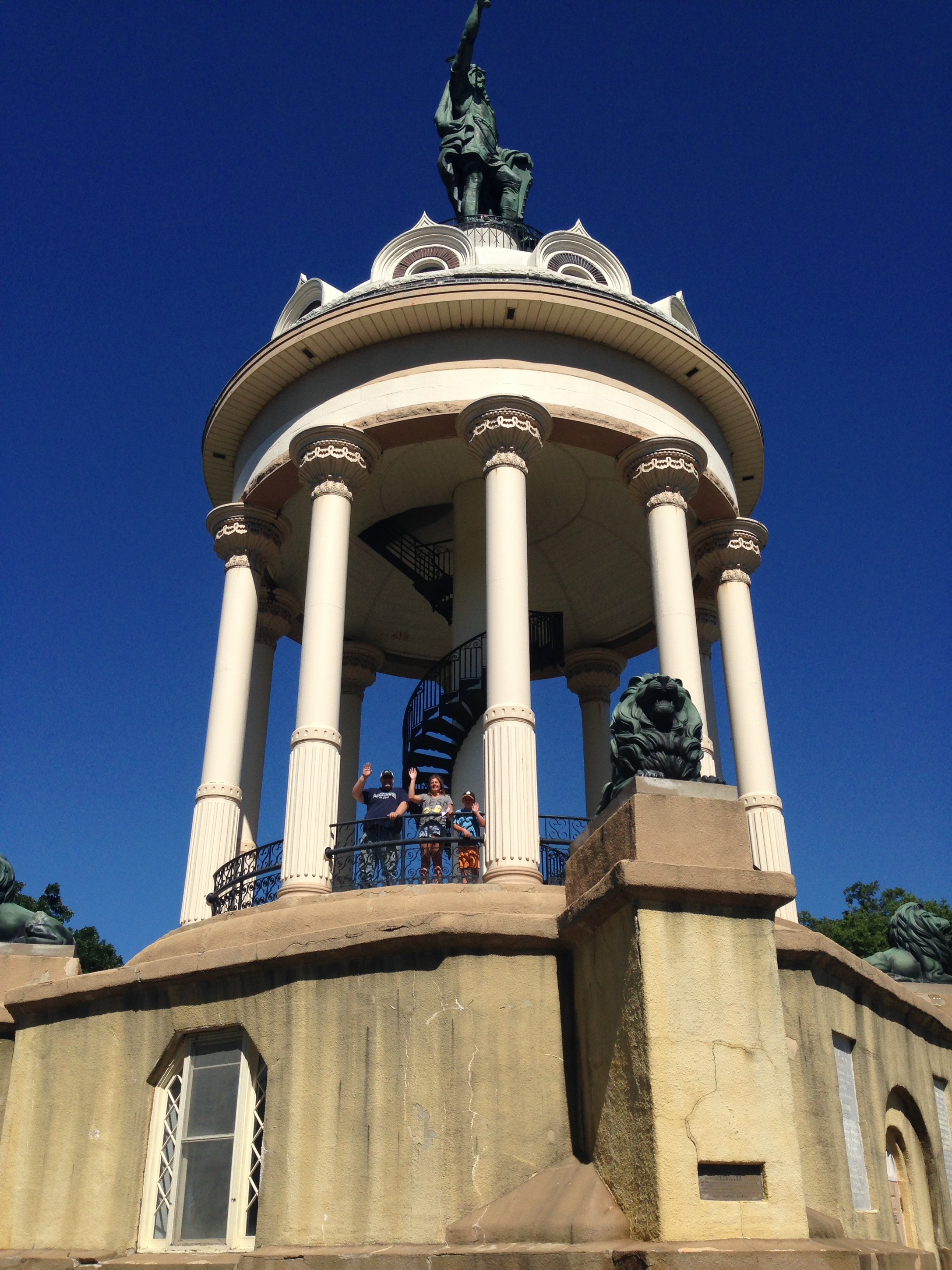 Our first stop was in New Ulm, MN. We stopped at Herman the German a large monument that is perched on a hill that overlooks the German town. Chad and the kids were going to go to the top. This is high and the kids were excited. Almost instantly Henry started crying. He was scared and didn’t want to do it. I urged him from the sidelines and Chad kept telling him that Daddy was right there. Henry conquered his fear and they climbed to the top.