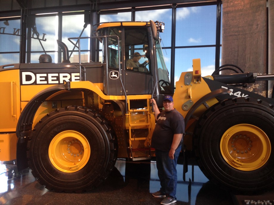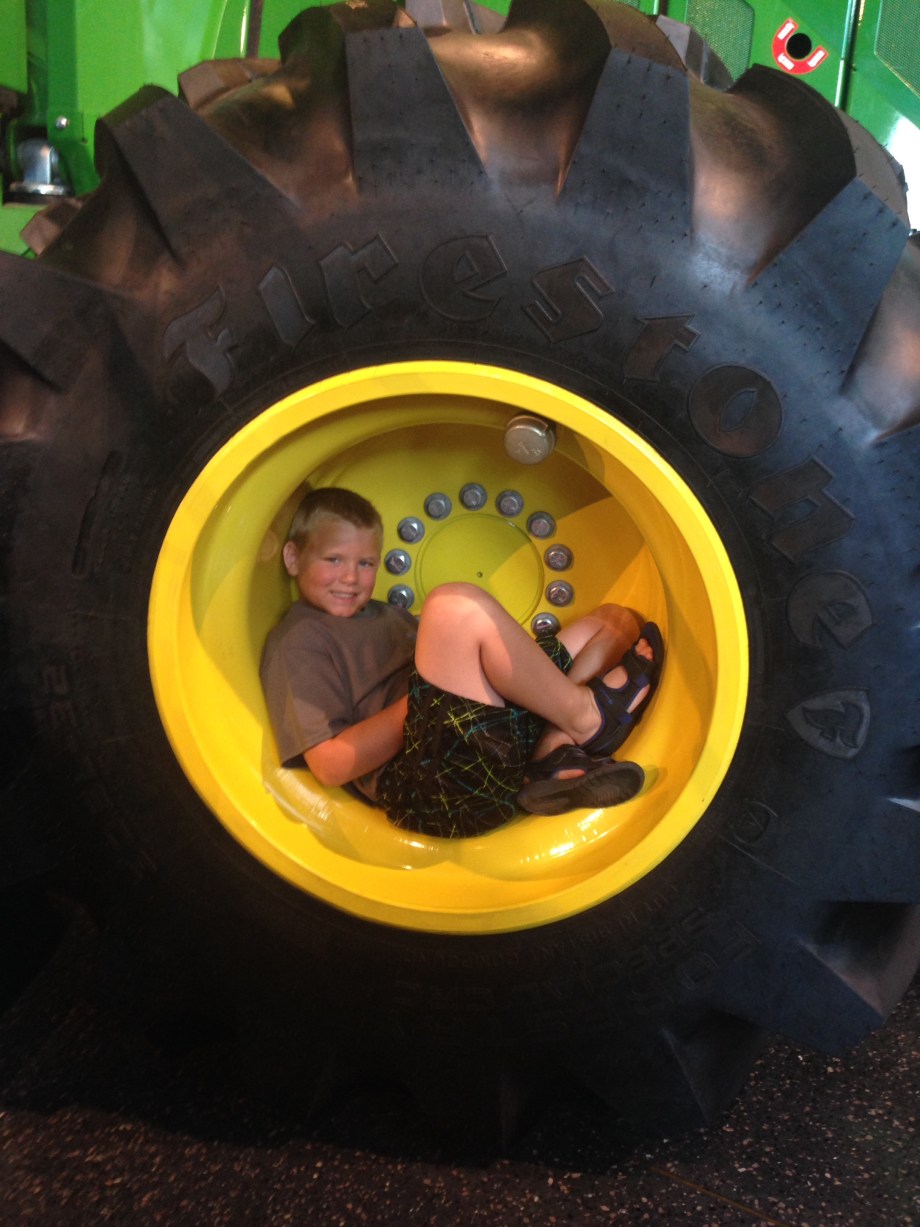 We crossed over the Mississippi River and entered the state of Illinois. Henry had to send a text to his godmother, he was in her state. Our destination in Moline was the John Deere Pavilion. There were tractors to see, climb on, and play with.