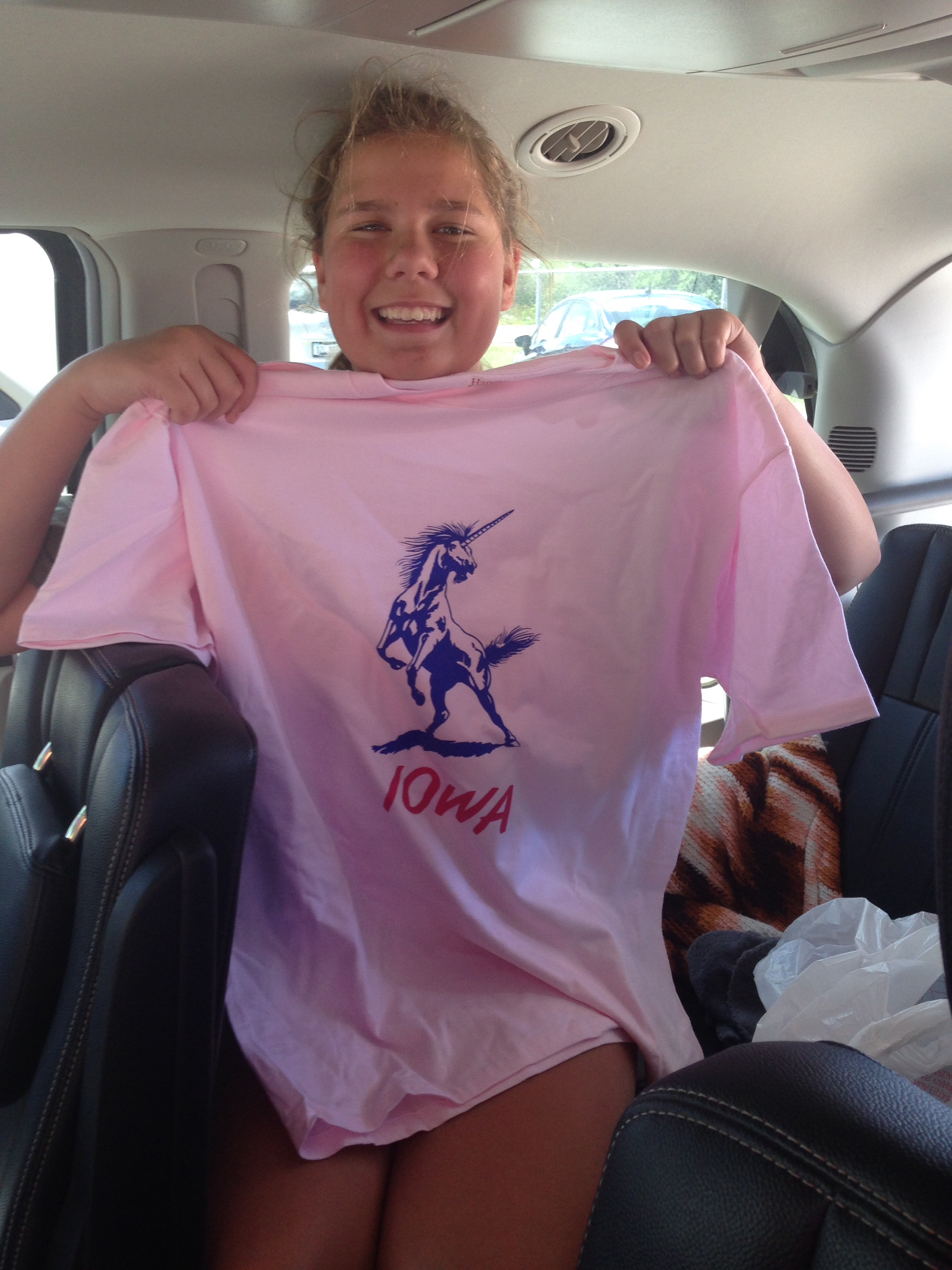 There was a print shop. You could design your own shirts or hats. Greta decided she was going to make a shirt. What says Iowa like an unicorn.