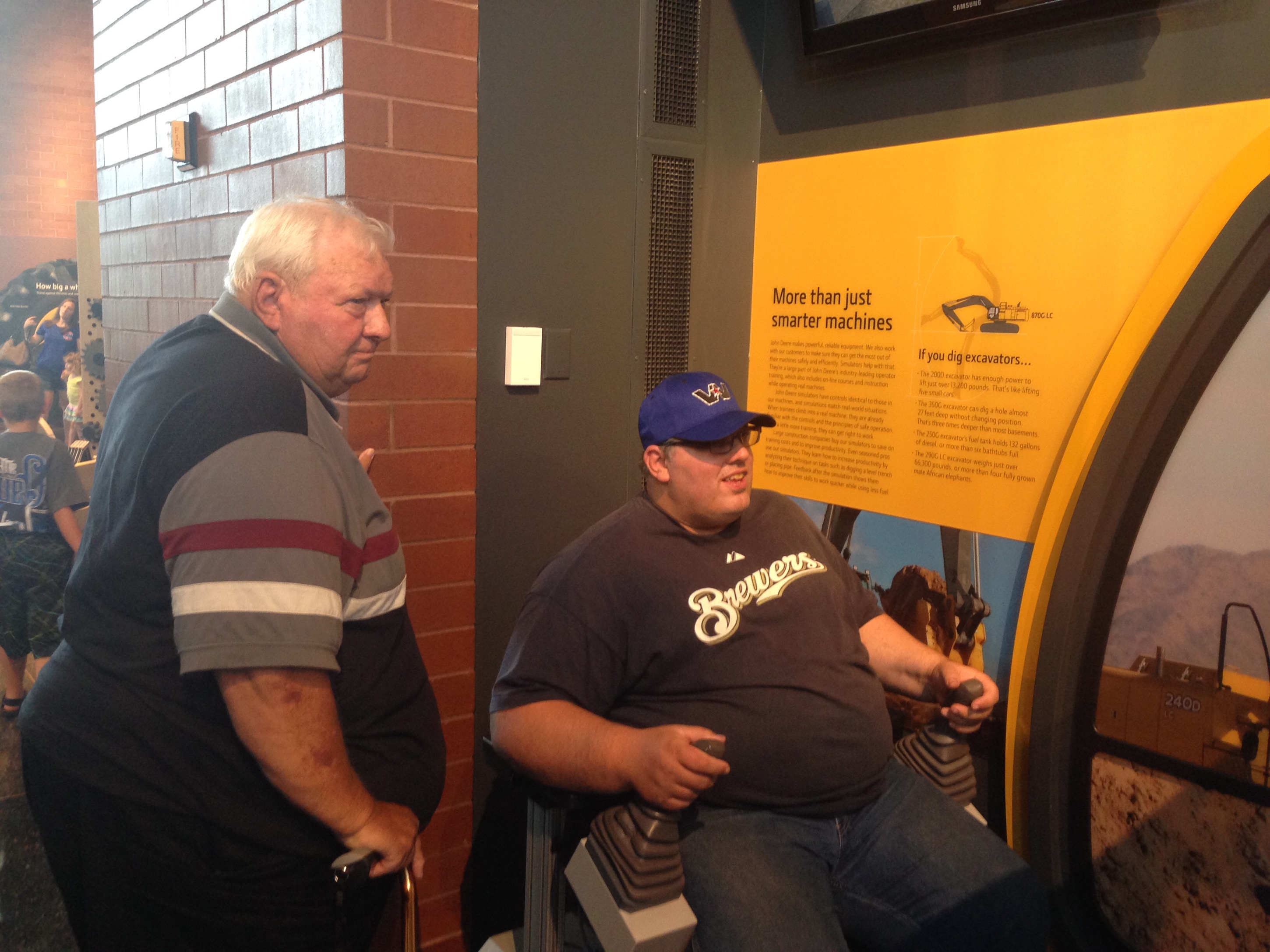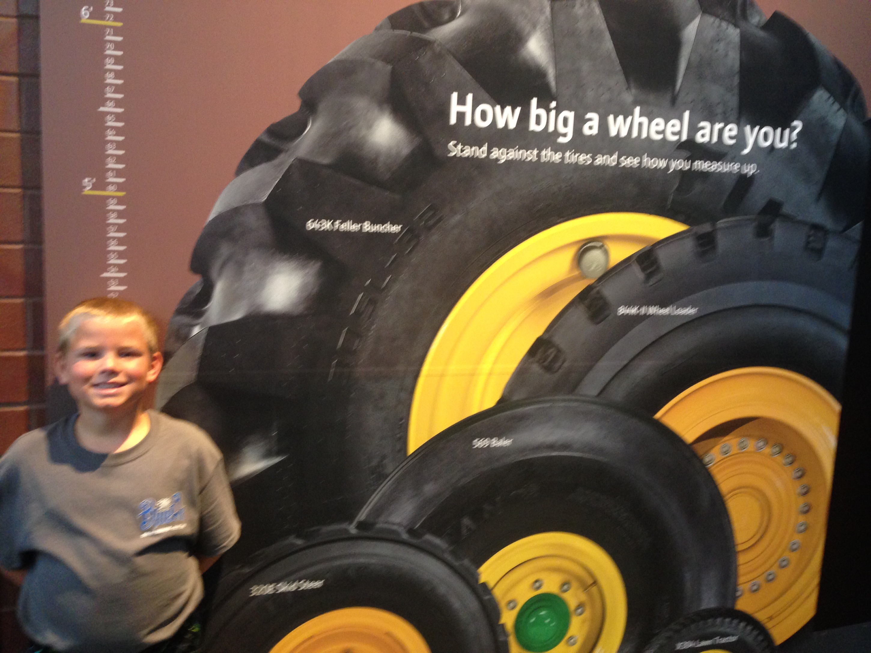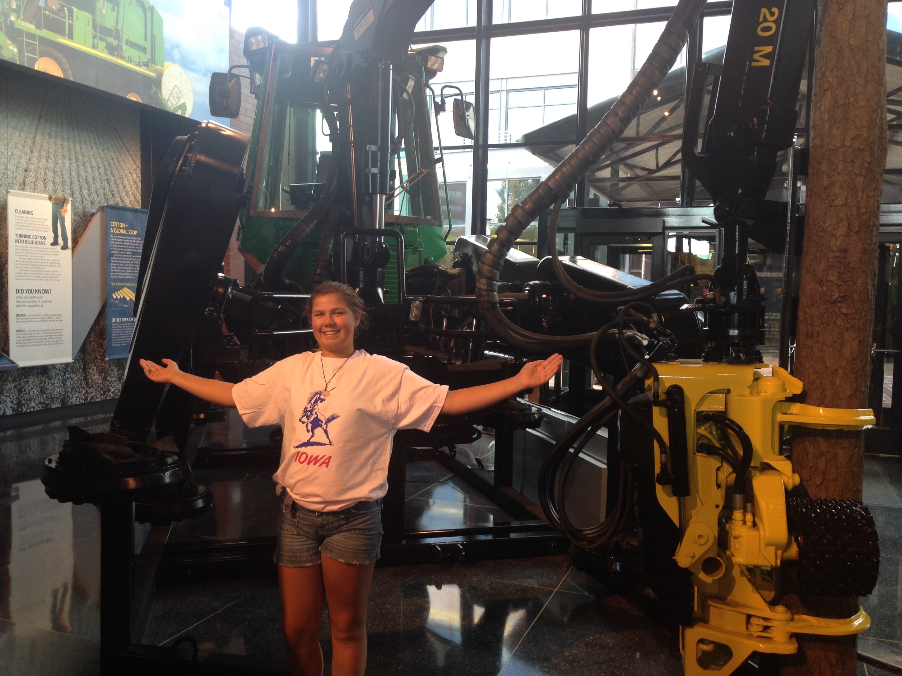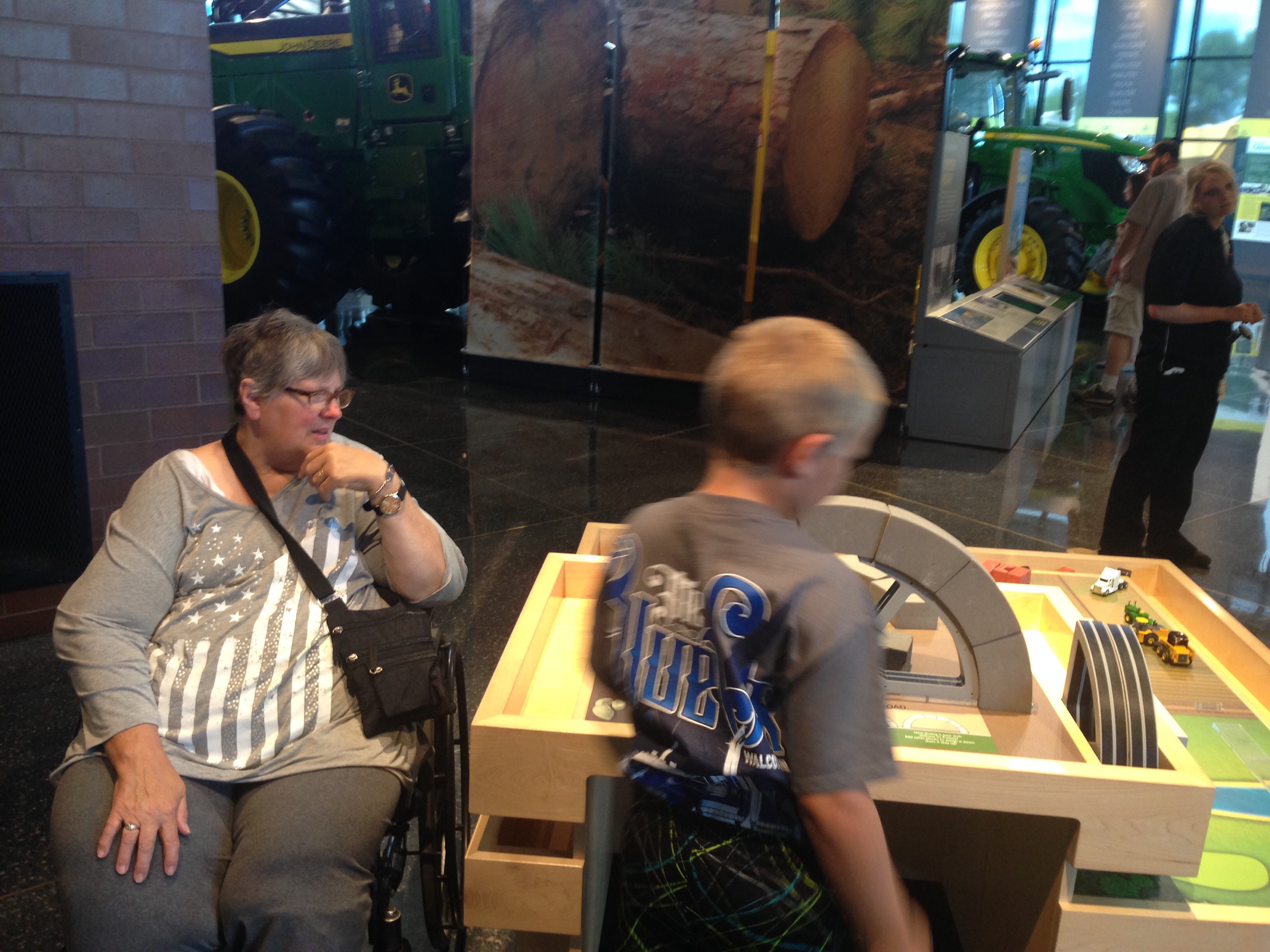 We crossed over the Mississippi River and entered the state of Illinois. Henry had to send a text to his godmother, he was in her state. Our destination in Moline was the John Deere Pavilion. There were tractors to see, climb on, and play with.